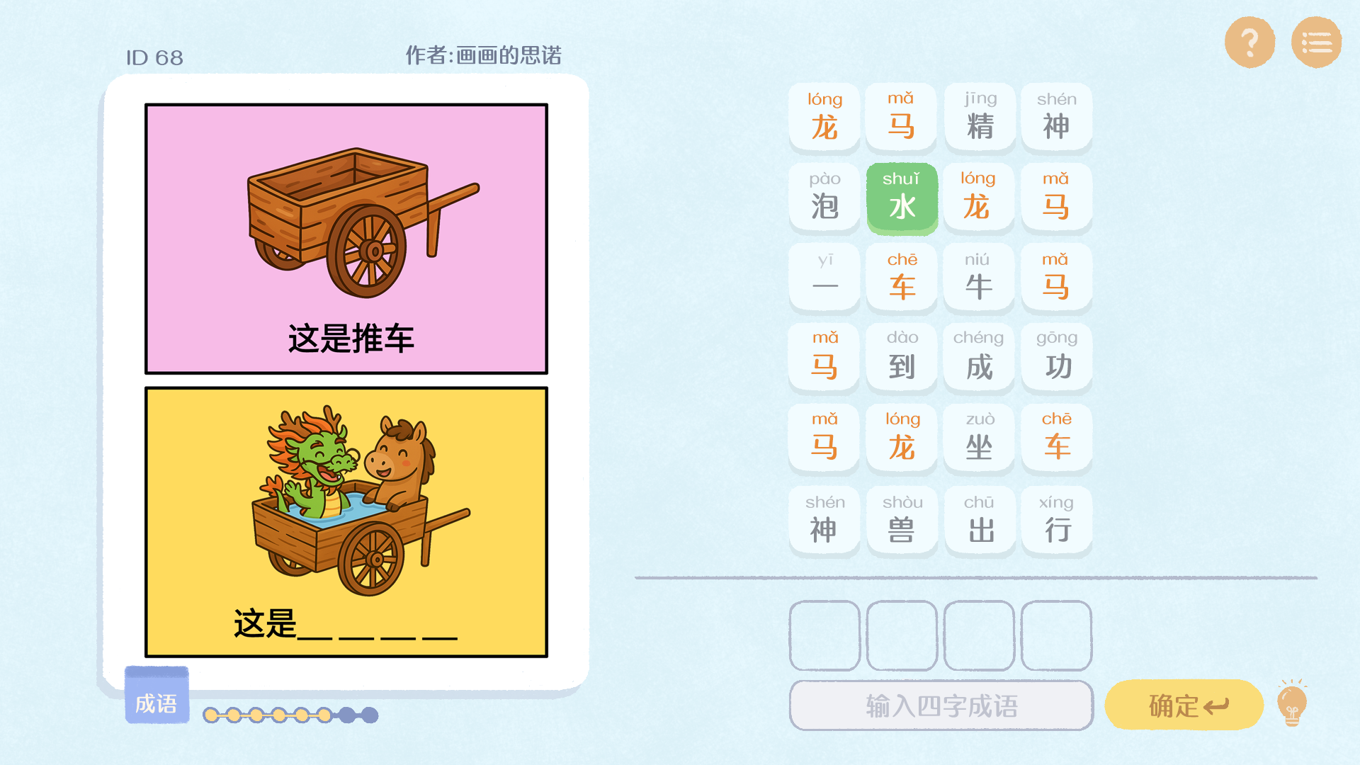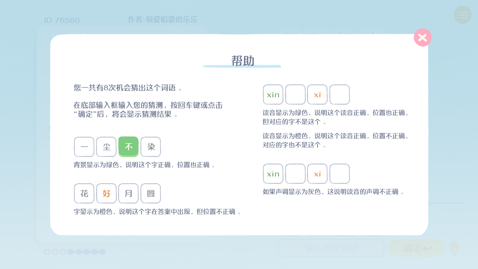 在1月18日上线的试玩版本中,目前已经上线300道题目,游戏采用《汉兜》一样的玩法,提供8次猜题机会,答案的正确和错误,采用不同的“音乐”和“颜色”来标注,通过一个字一个字猜测,逐步找到答案,烧脑程度逐步提高。