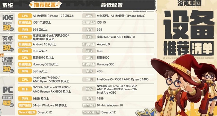 然后顺带和大家介绍下安卓端的配置需求,推荐是骁龙8g1或者同级别及以上的处理器,需要安卓10版本及以上,运行内存也要在8GB以上,并且要预留30GB的存储空间,因为该手游的体量还是蛮大的。