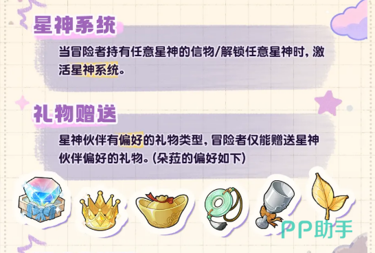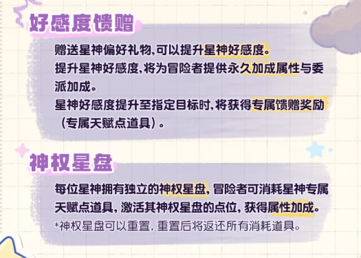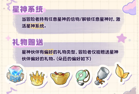 说到礼物系统,这里要注意一点——不是什么礼物都能送的。每位星神都有自己偏好的礼物类型,送错了是没有效果的,所以要先看清楚朵菈喜欢哪类礼物再去囤货。送对礼物之后,好感度会慢慢提升。好感度提升有什么用呢,简单来说就是能给冒险者带来永久属性加成,还有委派任务方面的加成。当好感度达到特定数值的时候,还会额外给出专属馈赠奖励,也就是神权星盘用的专属天赋点道具。
