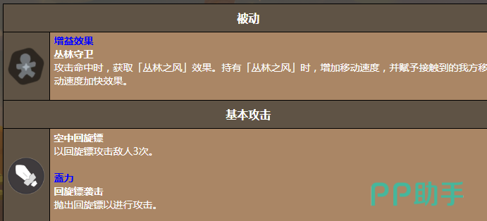 他的普通攻击是利落的空中回旋镖,三次连续打击,总是可以精准命中敌人,被动技能丛林守卫,就是让他在团队中成为移动增益核心的基础。只要攻击命中就能解锁丛林之风效果,可以迅速的提升自身的移动速度,身边的队友也可以共享这一份迅捷,在占据的过程中,就可以抢占先机。冲锋技能的一瞬间突进,就能让他灵活的调整站位,不管是支援队友,还是追击残敌,都可以快人一步。