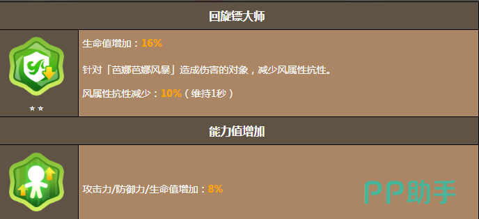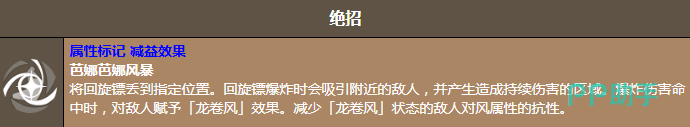 真正让大蕉饼干成为风系阵容核心的就是独有的减益,还有输出结合,特殊技能大蕉回旋镖会抛出两枚高速回旋镖不仅会造成可观的伤害,还可以给敌人挂上龙卷风标记,有效降低风属性抗性,可以给所有的队友输出铺路。绝招芭娜芭娜风暴更是压箱底的本领,将回旋镖投掷到指定的位置。爆炸时的引力就可以将周围的敌人全部的聚拢,持续伤害区域,让每一个敌人都无处可逃。