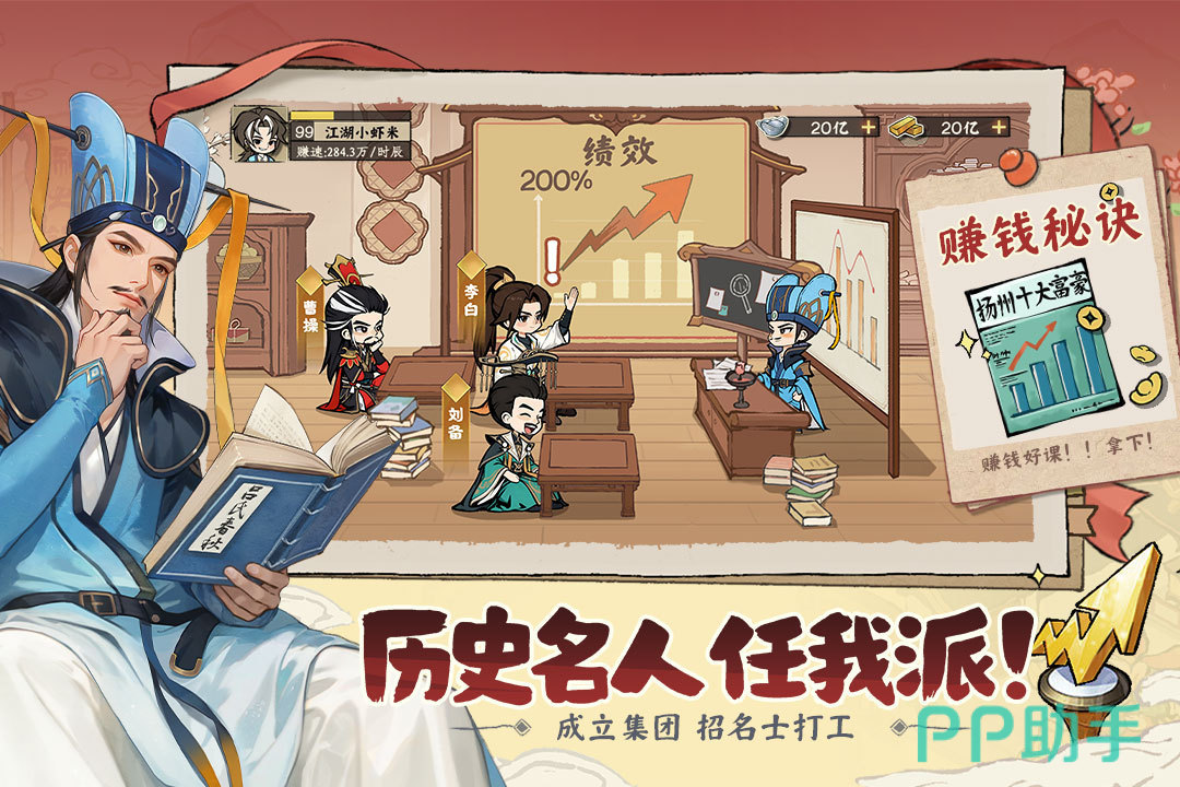 历史人物系统是本作一大亮点。玩家可通过完成经营目标、积累特定资源等方式,招募秦始皇担任账房先生、李白主导新品研发、沈万三负责资产配置等。每位名仕均携带专属加成属性,直接影响对应环节的产出效率、成本控制或营收增幅,深度融入经营闭环。