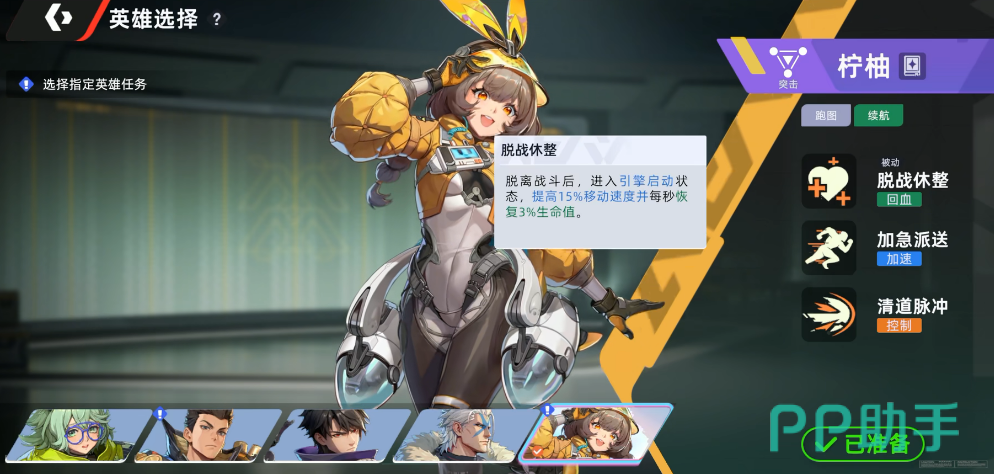 柠柚的被动技能为“引擎启动”:脱离战斗状态后自动激活,提供持续15%的移动速度加成,并每秒恢复3%最大生命值。该效果显著提升单局跑图效率与生存续航能力;脱战后绕行安全区域一圈即可回满血量,大幅降低对治疗类道具的依赖。
