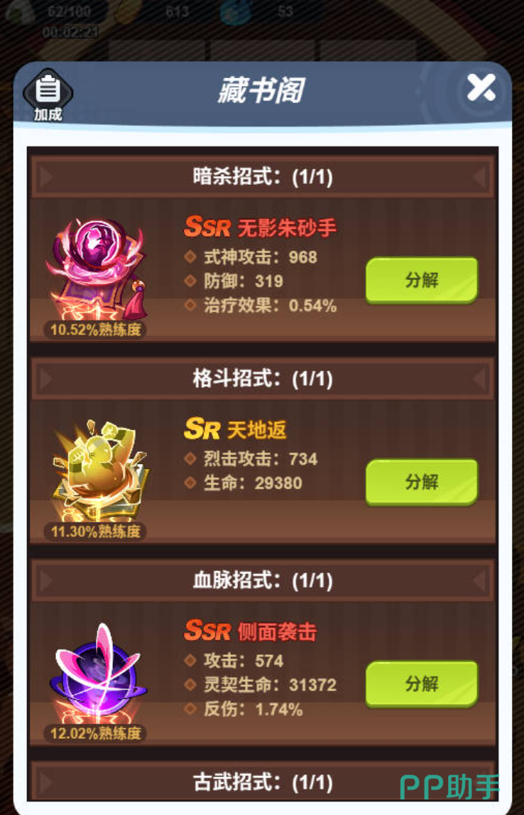 玩家在选择体验武馆的时候,主打的就是偷师学招式。玩家来到这里,每次将会消耗一个饭团,这时候只能够尝试一次,如果成功的话,就能够随机拿到暗杀、格斗、血脉、古武这四类招式。当然玩家也有机会,可能会面临失败,一旦失败之后将会什么都没有。一旦玩家拿到这些招式之后就能够直接装配在藏书阁,从而就能够给自己手中的角色增加攻击防御以及暴击。如果玩家碰到的是不需要使用的招式,建议玩家直接分解,不要让他占位置。当玩家将这些招式分解之后,就能够获得古币。古币其实是提升藏书阁的核心材料。