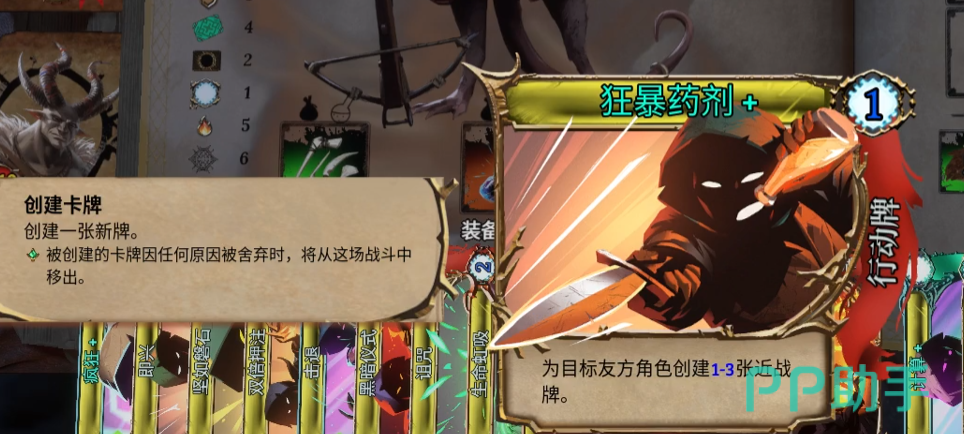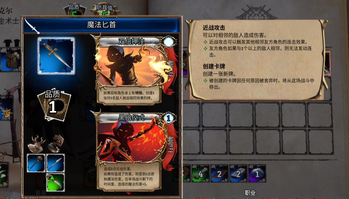 首先要看核心的输出和过牌组件。在给出的卡牌列表里,狂暴药剂是十分具有价值的一张起手牌,可以给目标友方角色创建1-3张近战牌,大大丰富了手牌资源,为之后的连击或者特效触发打下了基础。配合使用狂暴药剂这种一次性爆发性的道具,可以在关键的时候改变局势。除此之外,“黑暗仪式”虽然有反伤副作用,但是它造成魔法伤害+1的永久增益效果对依赖魔法输出的炼金术士流派来说非常重要,是构建后期无限成长体系的重要拼图之一,在装配时可以占据一席之地。