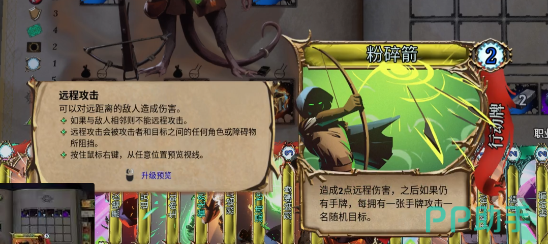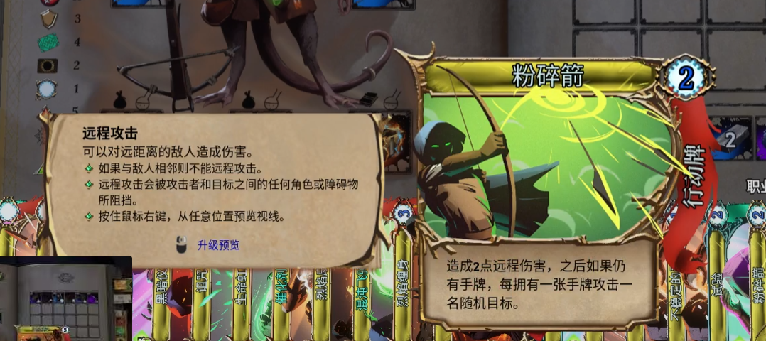 进攻方面用魔法匕首和粉碎箭配合使用可以造成非常大的连锁反应。魔法匕首属于近战攻击,可以触发附近的友方连续攻击的效果,但是需要友方和多个敌人相邻时才能发动,所以站位安排十分重要。此时,由于需要携带两张粉碎箭,所以这个策略就显得十分巧妙,粉碎箭造成远程伤害之后,如果手中还有牌,就可以再进行一次攻击随机的目标,与魔法匕首的连击机制形成了互补。