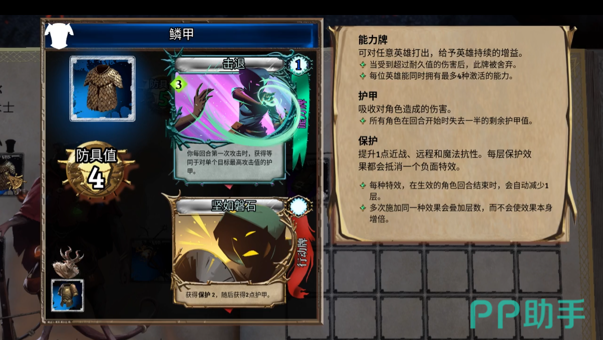 防御体系的建立也不能轻视,因为生存是输出的前提。鳞甲是张能力牌,可以给英雄持续提供属性,每个英雄能同时拥有1到2种激活能力,所以它经常被用作常驻缓冲的选择。而“防具”机制给玩家留出了一个缓冲地带,当受到的伤害大于耐久值的时候,牌就被抛弃掉了,避免了瞬间死亡。特别值得提出的是“坚如磐石”,它既给予保护抗性来对抗负面的特效,又可以直接得到2点护甲,这样的攻防兼备的特点正好符合炼金术士在混战中保持稳定地位的要求。