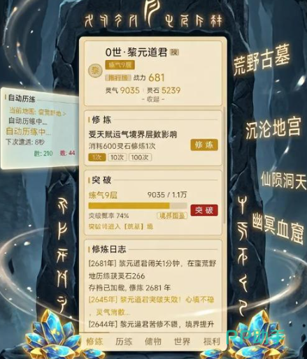 游戏巧妙融合暗黑系词缀系统与东方修仙境界体系,形成独特的内容架构。它不依赖炫目特效或复杂操作,而是以精准的文字叙事与扎实的数值演算构建沉浸感——玩家仿佛置身于一部动态演进的修真小说之中,从籍籍无名的凡俗修士起步,通过持续积累修为,逐层突破境界,最终叩响大罗金仙之门。