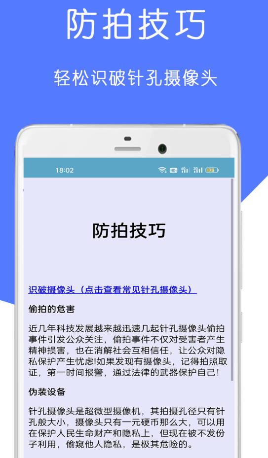 连上Wi-Fi之后,当前网络里所有接入设备都会被逐一过一遍,结合红外光线捕捉,两套方式配合,光线暗的环境下藏得住的设备也比较难逃。触发报警的时候声音震动双重提醒,不用盯着屏幕等结果。软件里整理了一套防偷拍知识内容,从怎么识别常见设备到不同场景下该怎么应对,写得挺通俗,新手也能看懂。