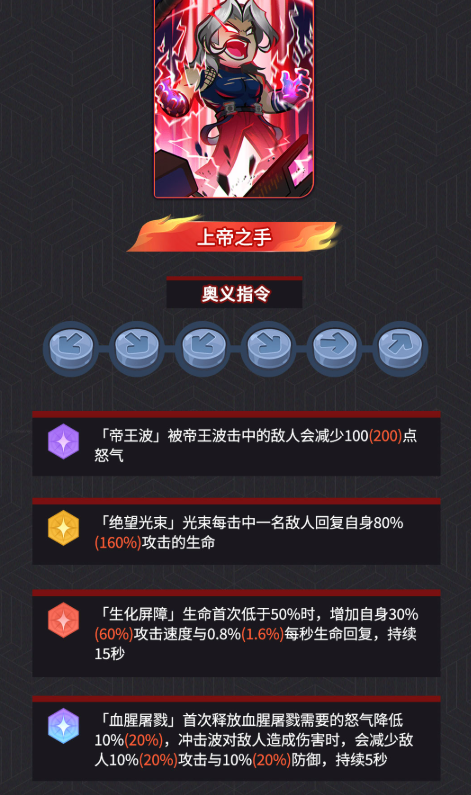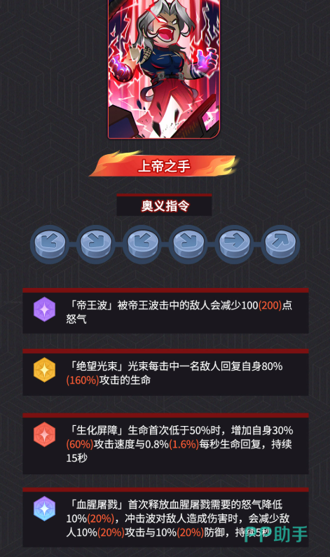 终极大招“上帝之手”是真正意义上的团战清场技,具备全屏瞬发、高倍率、无延迟判定等特性。实战中,与其周旋毫无意义,最优解是在战斗初期就利用高爆发组合快速压低敌方血线,在其能量积满前完成击杀。一旦该奥义成功释放,将大概率实现敌方全体单位瞬间蒸发,极低的操作容错率使其成为多数阵容的战术噩梦。