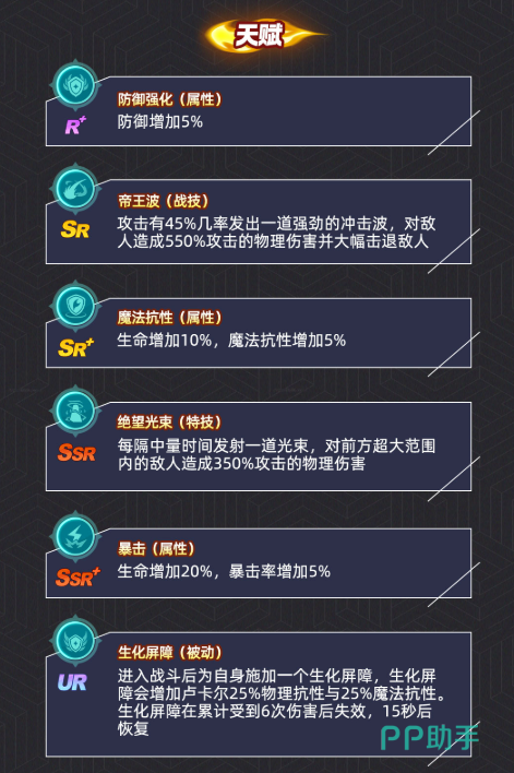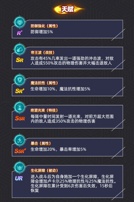 除首技外,卢卡尔还构建了完整的六维能力成长体系,涵盖物防提升5%、绝望光束、帝王波、暴击率、魔法抗性及生化屏障六大模块,层层递进强化生存与压制能力。其中二技能“帝王波”为其关键单体终结手段,蓄力后发射一道高能冲击波,造成550%物理伤害,并强制击退路径上所有敌人。虽存在可预判的施法动作,但其击退效果足以打乱敌方阵型节奏,应对策略依赖前置控制链的精准衔接——即在其抬手瞬间施加稳定控制,避免被连续击退导致阵型瓦解。