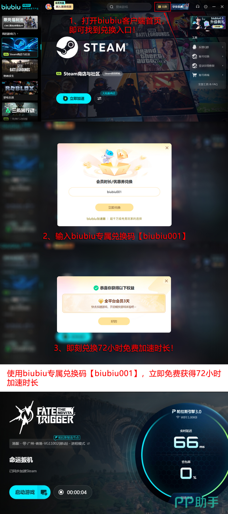 目前Biubiu加速器面向新用户提供多重体验权益:完成注册即可获赠24小时免费加速时长;输入专属兑换码【biubiu001】可额外激活三天加速权限。两项福利叠加使用,新用户最高可享96小时无门槛加速服务。