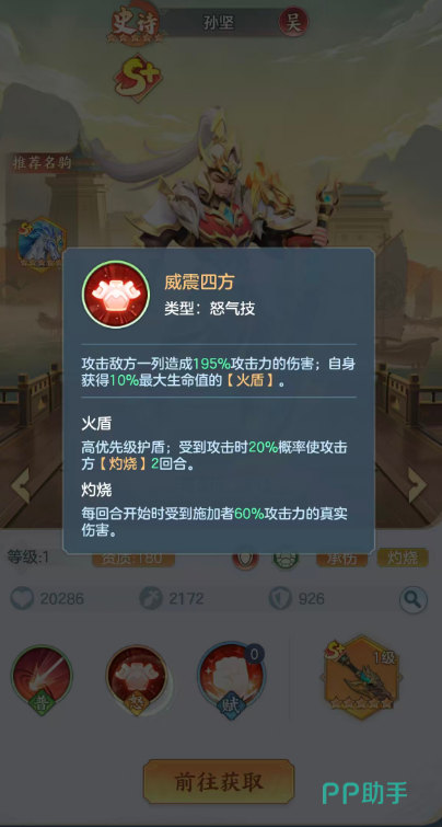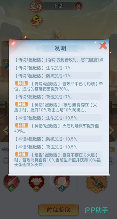 在达到传说1星的时候,孙坚可以通过这里归魂的能力来让自己使用普攻的时候得到更多的怒气加成,而后期再利用他后期提升的各种怒气恢复效果当中也可以给已经有灼烧效果的单位,造成解除能量提升的效果,所以孙权身上不存在护盾的时候,后期在有经济提升了之后,孙坚他还可以根据这里普攻能力,消耗自身10%当前生命数值,然后获得一个10%最大生命数的火盾来消耗自己能力搭配了足够的防御之后,整体阵容里面大家就要注意建议给他搭配一个灼烧流阵容。