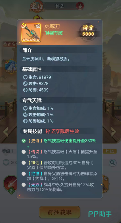 不管是阵容里面需要的灼烧也好,还是单体输出需要的灼烧持续伤害也好,完全可以搭配起来孙坚,孙坚在这里作为阵容前排的话,大家也要记得给他搭配一个虎威刀,这样在这种效果里面他才可以根据自己的怒气技能带来基础伤害的提升,这里一次性的提升数值都达到了230%,后期在传说品质的时候,他通过这个活动可以给怒气技能带来15%的提升,怒气技能当中的火盾带来更多防御效果之后,他放在灼烧队前排里面,也可以保证我方灼烧队有更强的生存效果。