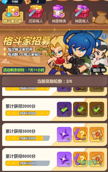 游戏核心周循环采用稳定三阶推进结构,每三周构成一个完整发展周期。第一周为【招募活动】,聚焦战力阵容拓展,集中产出高星级格斗家碎片与招募券,是组建主力梯队的关键窗口;第二周为【神器活动】,以神器培养等级为唯一排名依据,强调对既有装备的精细化运营,避免资源浪费于盲目抽取;第三周为【奥义活动】,主产奥义密转卷与觉醒石,直接关联角色终极技能解锁与质变升级。三者形成“获取—强化—升华”的闭环路径,确保角色成长维度均衡、节奏可控。