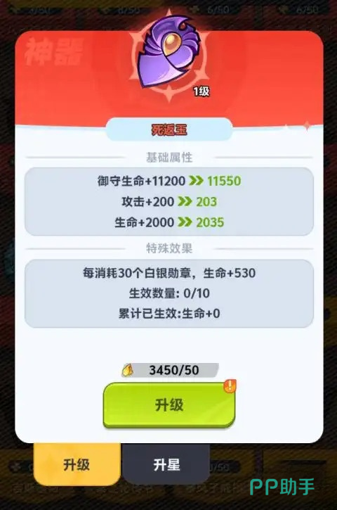 除单件属性加成外,神器数量积累亦可激活额外羁绊效果。当集齐指定数量的神器时,将解锁百分比类全局属性增益,此类加成在中后期对战力跃升具有显著放大效应。因此,持续扩充神器库是长期战力构筑的重要路径。以热门神器“死返玉”为例,其基础效果为提升攻击力与生命值;消耗30个白银勋章可激活1层效果,增加530点生命值,最高支持叠加10层,总计提供5300点生命值加成。