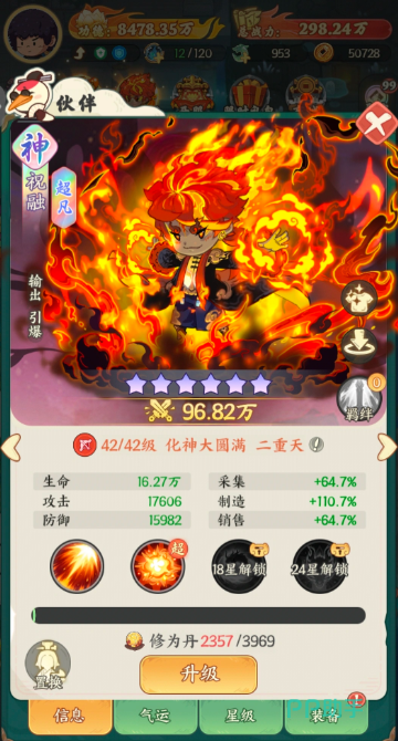 首先这个阵容里面大家可以找到强势的伙伴祝融,祝融作为核心的话,他的基础能力当中可以有足够的攻击属性,而且在前7天的限时活动里面,大家招募up角色里面还是比较容易活跃,取得他只要有相应的皮肤加成,那么还可以提升自身3%的攻击能力,然后附加1200的基础攻击,这里建议大家为他搭配一个炎煌神君的伙伴皮肤,有这个皮肤让阵容当中的祝融更强势一些,然后有法器的时候,他能够带来的技能效果当中也会额外增加50%的攻击,后期法器的结束提升的时候,带来的攻击提升自然也会不断的有更高上限,达到3级的时候,这里都可以提升10%的伤害了,而9级的时候提升的伤害增幅虽然只有20%,但是就是体现在他暴击的效果当中,所以在他本身的属性比较好的时候,后期叠加伤害的增幅也比较高,这里如果要为他进行整体阵容的组合作为核心,那么建议大家去玩混沌阵容。