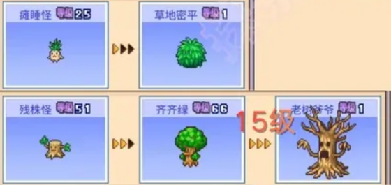 比如前期在进化1级到2级的时候,这里布丁怪它就可以进化为夏威夷布丁怪,动动朗可以进化为动动艾尔,菇宝宝可以进化为蘑菇怪,最后进化为小编刚刚说的金针菇大哥,而瘫睡怪在这里进化了之后就变成草地密平,残株怪外观上面看起来像是一个小树桩,进化了以后它就会变成齐齐绿,此时就会变成像大树一样的外观,而再一次进化,也就是达到三级进化以后,它就变成了老树爷爷,外观上面会更加拟人化,但是此时没有绿色的叶子,而是变成一个强大的树桩,还有发达的根系,所以在不断进化的过程当中,这些怪物它们的外观上面变化也是非常大的。