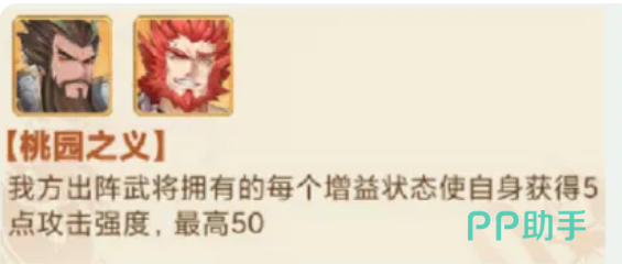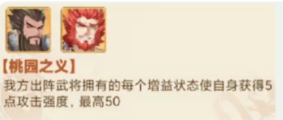 当中大家就要注意用长板断喝这个技能,此时对范围内的敌军都可以带来90%的物理伤害之后,只要是武将身上没有一个增益buff加成的情况下,他就会扣除目标身上25点的怒气效果,而这里触发了桃园之义的时候,就可以注意我方出阵的武将他们身上每有一个增益状态的时候,我方就可以获取更多的强度加成,所以放在用这这里的话,关羽跟张飞绝对是一个固定搭配,特别是在85级之前,关羽他的能力基本都是可以达到一个上场强度的,PVE里面他也是必上场的,在前期资源大家都偏向给关羽投喂的时候,就要注意他的增益buff只要触发概率提升起来,那么这里他怒气技能后期用各种暴击的概率就非常大了,还可以配合诸葛亮的技能。