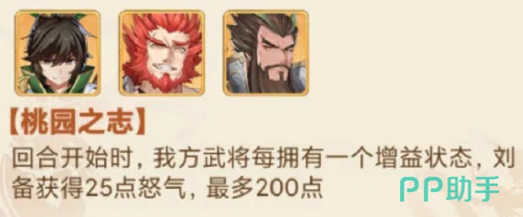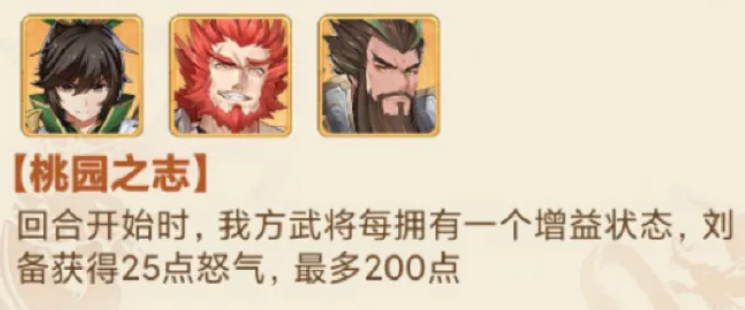 阵容里面大家可以用到桃园的三兄弟来作为核心,诸葛亮也可以放在其中,刘关张在这里他们用来推图的话,搭配起来有诸葛亮,大家就可以保证阵容推图速度,那么优势当中大家可以看到他们不同的技能范围都是非常大的,而且在移动力上面也是有足够的点数加成,后期只要是范围内的有我方武将的增益提升的话,在这里可以得到随机的增益加成效果,而后期大家用到的成员里面,刘备、诸葛亮跟关羽放在一起还可以触发桃园之志这个羁绊能力,让我方武将拥有增益状态之后,获取更多的怒气加成,最多的情况下他们得到200点怒气积攒的时候,得到的数值提升是非常高的,在这里大家还可以通过蜀国带来的buff输出来保证整体阵容核心的能力。