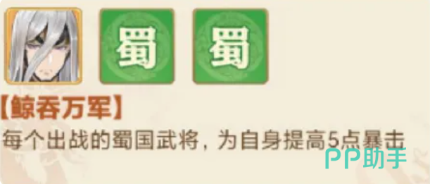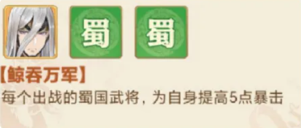这样的话限制对手输出也是有非常多的机会,最后一个位置上大家还可以放一个蜀国的魏延,这样的话后期的核心技能大家就可以用他的反骨带来暴击跟爆伤的提升,暴击增加10点以后,爆伤也会增加5点,而在连携效果上面,还有一个鲸吞万军的羁绊可以触发,这里触发这个鲸吞万军之后每出战一个蜀国武将的时候,阵容当中角色都会提升5点暴击,所以在这个蜀国阵容里面,魏延同样也是带有高额输出的一类武将,前期大家过副本的话,加上他后期,后期也可以用来打军团,拥有反骨的魏延确实也是现在大家在场内非常重要的一员猛将,其他成员也会比较需要他带去的这类用久增益效果。