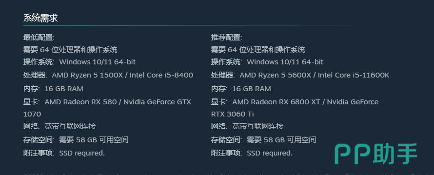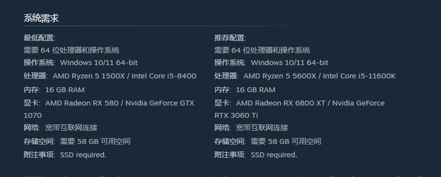 显卡要求同样友好,NVIDIA GTX 1070Ti或AMD Radeon RX 580这类入门级独立显卡已完全足够支撑中低画质下的稳定帧率输出,无需额外升级至新一代型号。存储空间需预留至少58GB可用容量,并强烈建议将游戏安装于固态硬盘(SSD)中,此举可使加载速度提升约一倍,显著缩短等待时间,降低因读取延迟引发的体验断层。