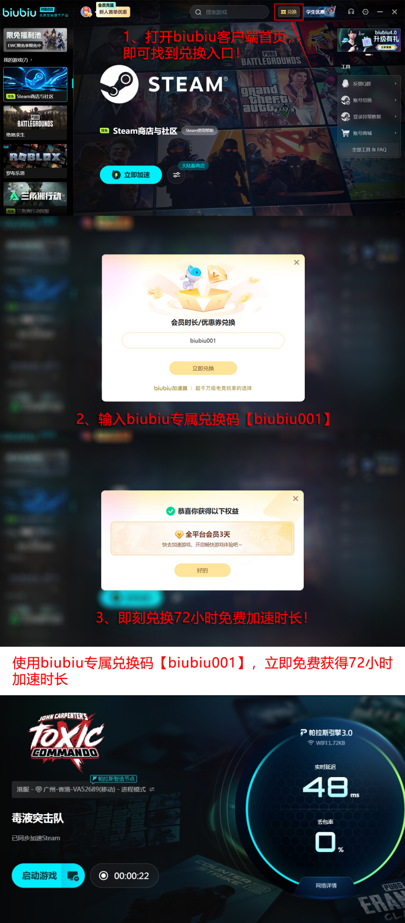 对于多数已具备达标硬件的玩家而言,进一步提升流畅度最直接的方式并非更换设备,而是借助网络加速服务。biubiu加速器依托九游、交易猫、biubiu加速器三大产品同属阿里巴巴灵犀互娱旗下所构建的技术生态,拥有覆盖全国主要区域的优质节点资源,线路调度智能高效,有效规避高峰拥堵。值得一提的是,该加速器亦获得PUBG职业选手小叮当公开推荐,其实际应用效果经受过高强度赛事环境验证。当前新老用户均可领取专属福利:输入兑换码【biubiu001】即可获赠3天免费加速时长;首次注册的新用户完成登录后,还可额外叠加24小时试用权限,合计可享96小时无门槛加速体验。
