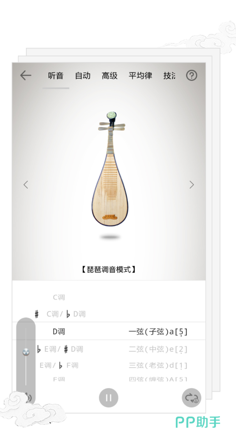 专门为琵琶设计,基于真实音色采样做的算法,识别定弦的准确度比通用调音工具稳定不少。调音模式分了五种,听音、自动定弦、高级调音、十二平均律和技法模式,覆盖了从入门练习到专业演出的不同场景。基准音可以选琵琶、三十六簧笙、三角钢琴或扬琴,节拍器的音源由专业打击乐演奏家录制,击鼓锤、木鱼、踩镲等七种音色,节奏质感和通用提示音比完全不同。