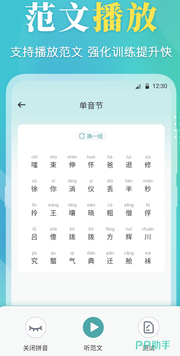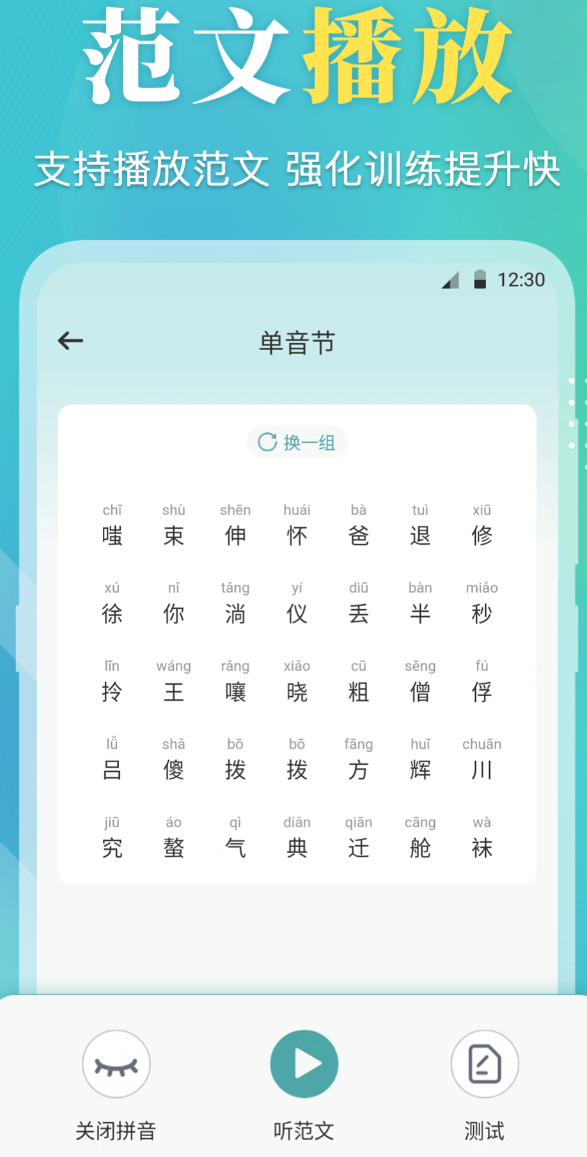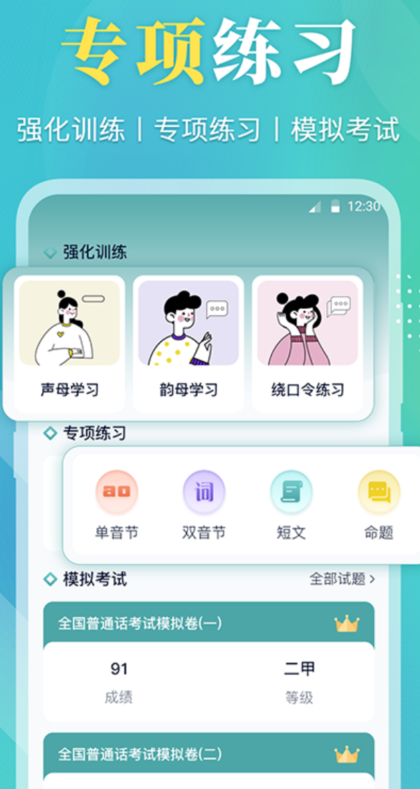 模拟测试系统用的是和官方考试一样的评分标准,测完生成详细报告,自己的真实水平一目了然。13个常见发音难点都有专项训练,平翘舌混淆、前后鼻音不分这些问题,逐个击破,不是走马观花地过一遍。声母、韵母、声调到短文朗读,练习体系覆盖了考试涉及的所有内容,可以专门挑薄弱的地方练,不用从头到尾全刷一遍。