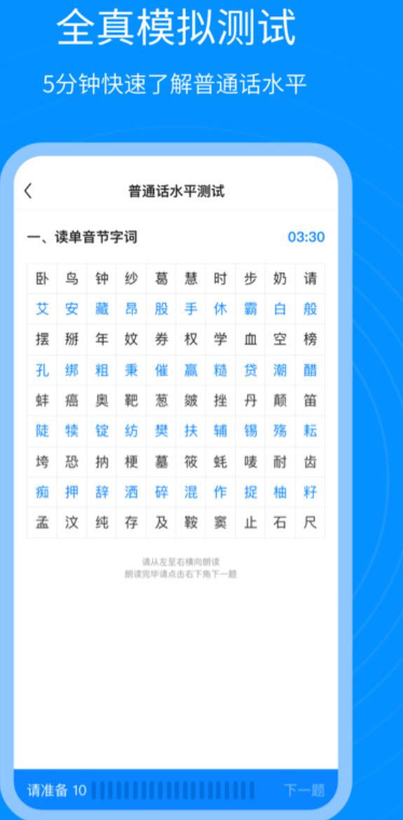 考普通话之前,很多人最担心的就是不熟悉考试流程,到了考场容易慌。模拟真实考试界面,从单音节字词到命题说话,完整流程都能提前走一遍,考试当天不会觉得陌生。测试完成后系统会出报告,具体哪个音节出了问题,标注得很清楚,改起来有方向。官方词语表、50篇朗读文章和50篇命题说话素材都收录了,配有标准发音示范,随时可以对照练习。