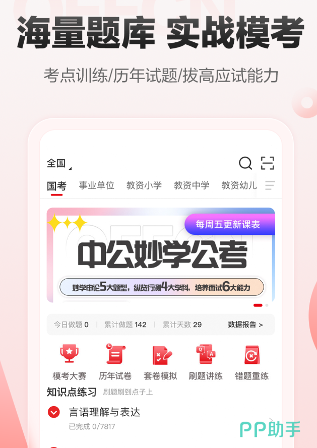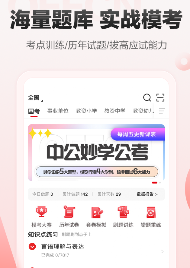 公务员、事业单位、教师招聘、军队文职这些考试都能用,题目经过人工筛选,质量把控比较严。引导做题人去理解背后的逻辑,而不是单纯靠记。模考频率有保证,和大批考生同台练习,做完能看到自己在同岗位里的位置,差距在哪里比较直观。错题归档后会自动生成强化训练集,支持制定针对性提分计划,复习方向不会跑偏。