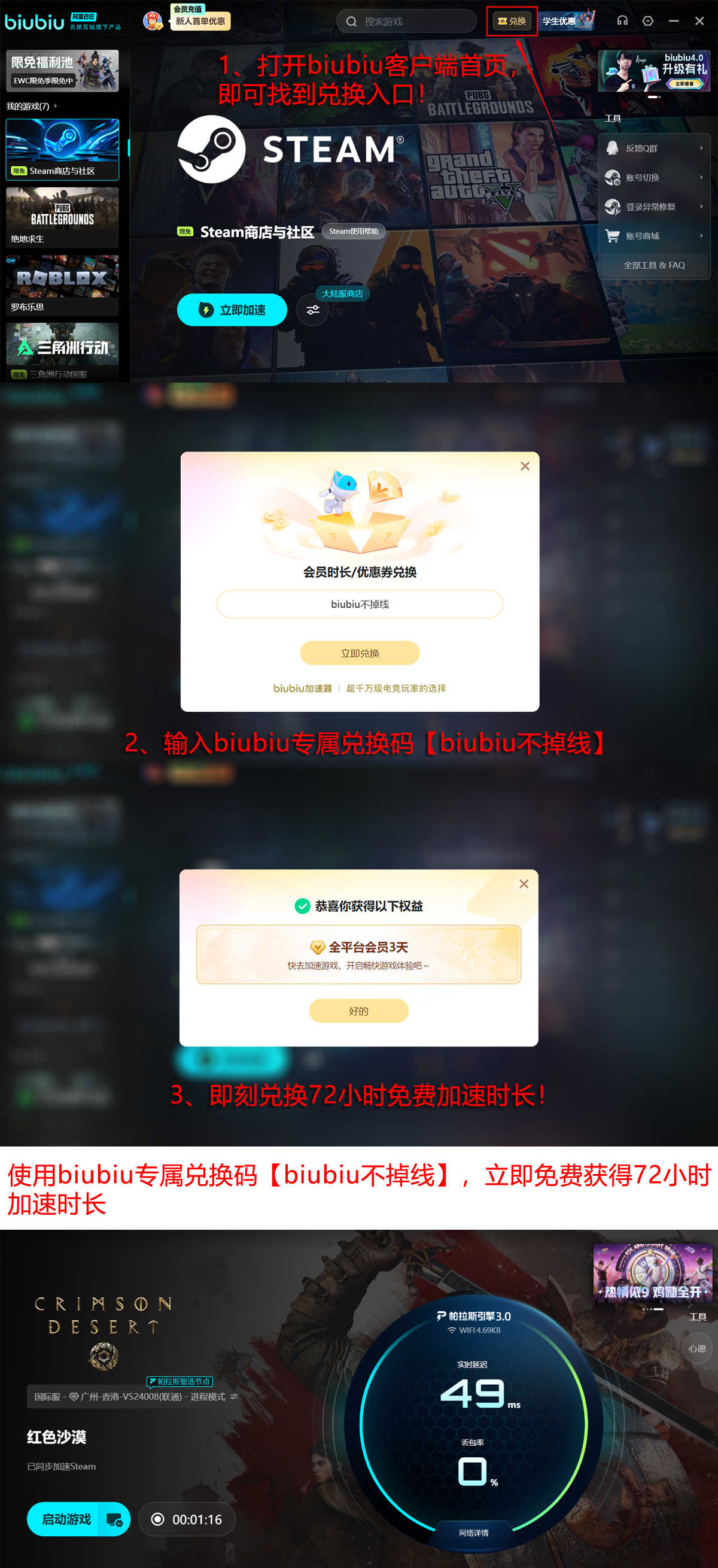 这样一款好玩的游戏先不要急着入手和体验,而是先准备好综合性能最厉害的biubiu加速器来给游戏进行加速,这款加速器采用的帕拉斯3.0加速引擎能全面的贴合这款游戏,还有世界冠军选手XDD的代言品质有保证。同时它的福利也是很好很不错的,新人只要注册登录就能获得24小时的免费加速,再通过激活码【biubiu不掉线】中领取的72小时,加起来新人一共是可以获得96小时的免费加速时长的福利哦。