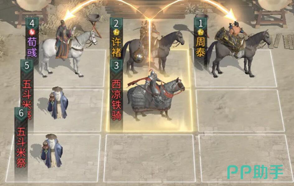 在站位方面的话,许褚必须要站在其他两个人的追击格当中,这样的话才能够让其他两个人的增益更加的稳定。而周泰的保护效果也能够精准的触发,在这样的情况下,可以让许褚在追击格当中,输出时实现最大化。兵种之间的合理搭配也需要根据兵种的特征在许褚的下方可以放一个西凉铁骑,这样的话能够提升前排的坦度跟冲锋方面的能力。荀彧下方可以直接放两个五斗米祭,利用他的辅助能力,进一步强化整个队伍的续航跟增益效果,在这样的状态下,整个队伍的阵容将会变得更加的强悍。