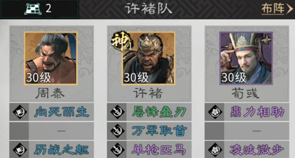 荀彧作为辅助,它能够有效的增益加持,一旦施展了天赋技能王佐之才之后,能够有效的提升许褚的武力跟攻击力。额外,他如果施展了主动技能鼎力相助的话,可以给追击单位达到增伤的作用。其实整个阵容的强度,一半是要看玩家合理的搭配,另外一半主打的就是布阵。护卫点杀队的站位跟兵种之间的合理搭配,往往也能够给玩家提升战斗实力。
