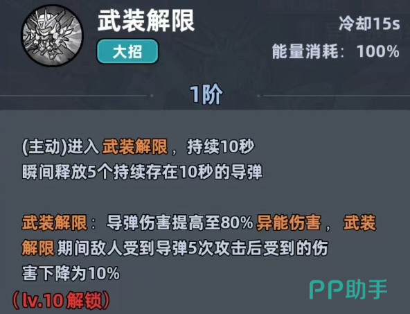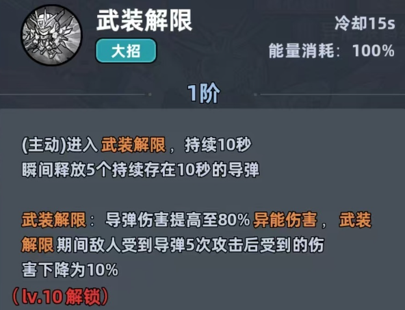 打开终极技能,进入到武装解限的状态时,瞬发5枚导弹还可以提升伤害。前中期不管是推主线还是刷副本,伤害都是足够使用的。当然机甲战士也并不是完美的,后期在面对高血量精英怪时。单轮的爆发有一些弱,但完全不需要选择放弃,只要从主C转为副C。资源上一点都不会浪费,全程都可以发挥作用,这也是比其他输出角色更吃香的地方。在养机甲战士时,不要选择乱堆属性,一定要拎清楚优先级。