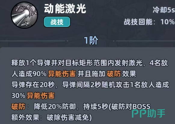 机甲战士主要的优点就在于脱手持续输出,并不需要一直手动去操作,在刷本打群怪的时候还是比较省心的。主动技能激光冷却只有5秒,放出去,不仅可以给矩形范围内的敌人造成90%的伤害还会挂20%的破防debuff。在打Boss的时候破除伤害减免,这效果确实很实用。更关键的是发射的导弹还会停留20秒,每相隔两秒就会自动锁敌,然后打出30%的伤害。清理多波次小怪就可以直接消除所有的敌人。