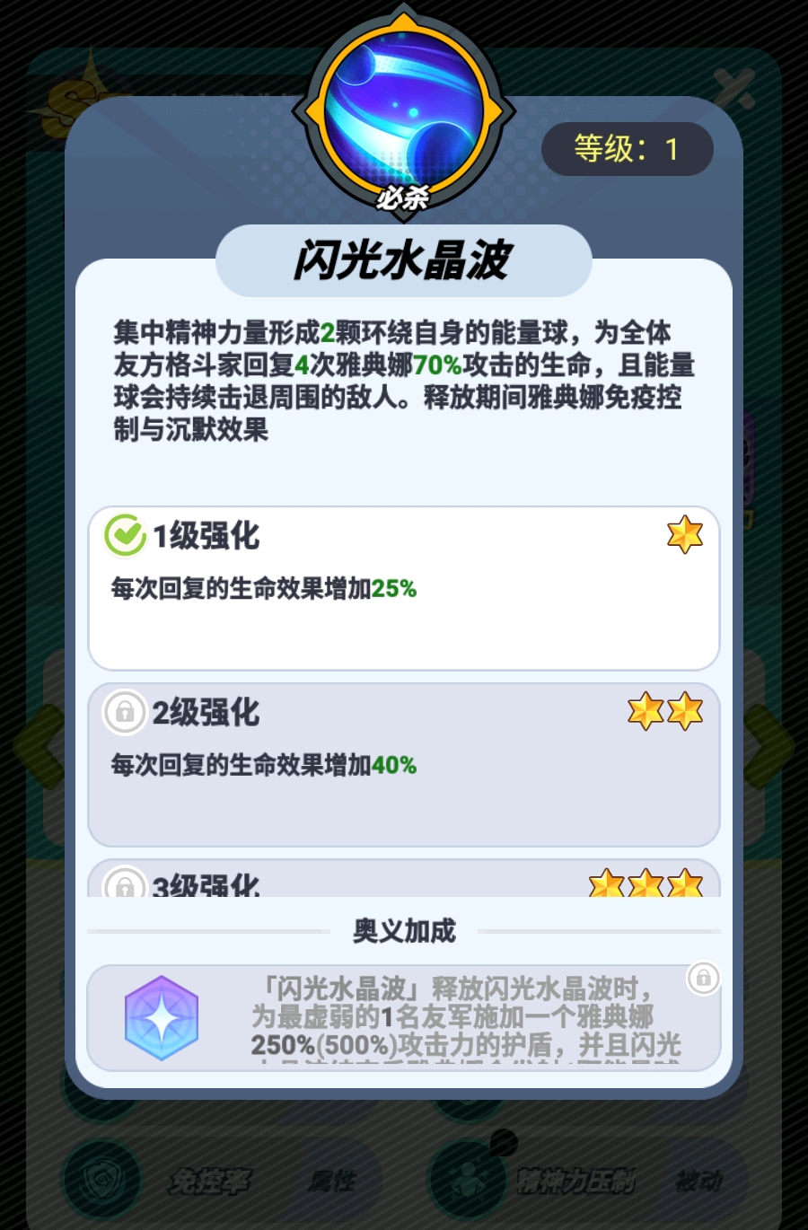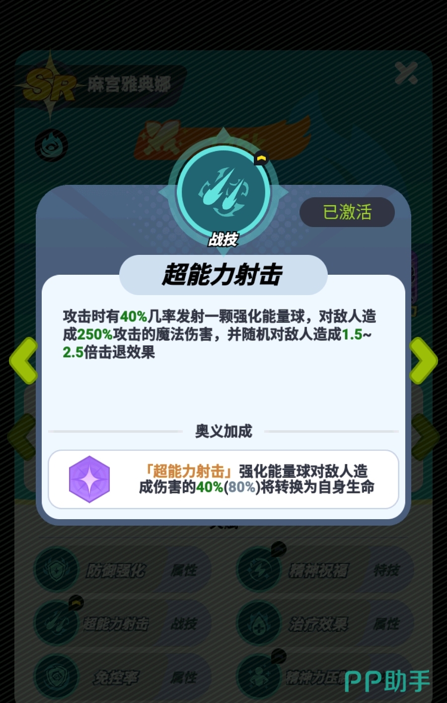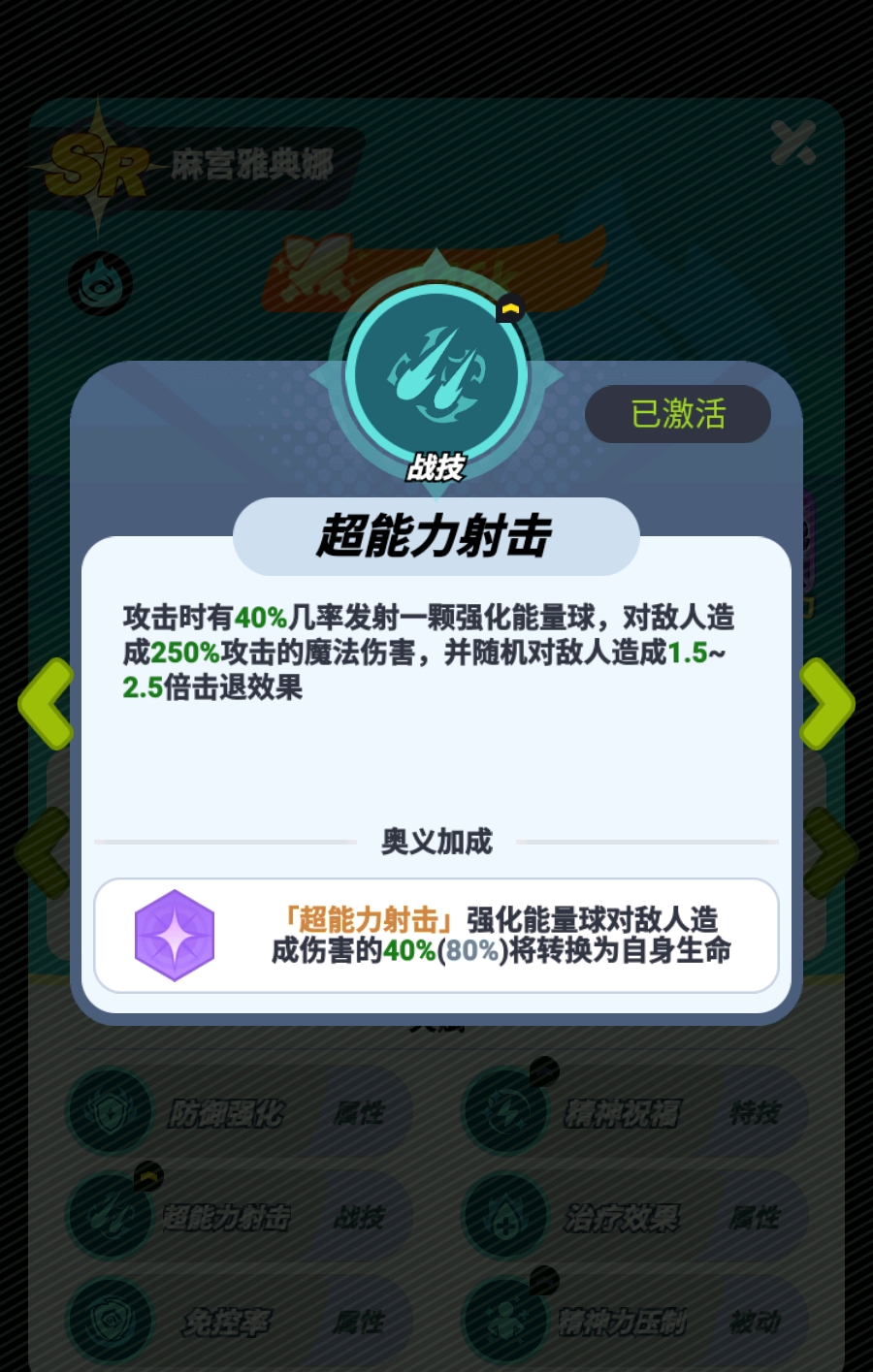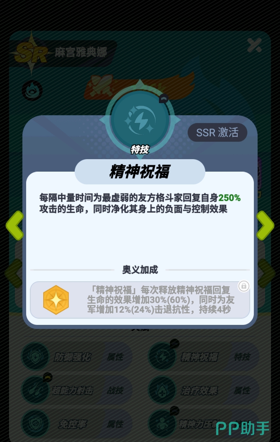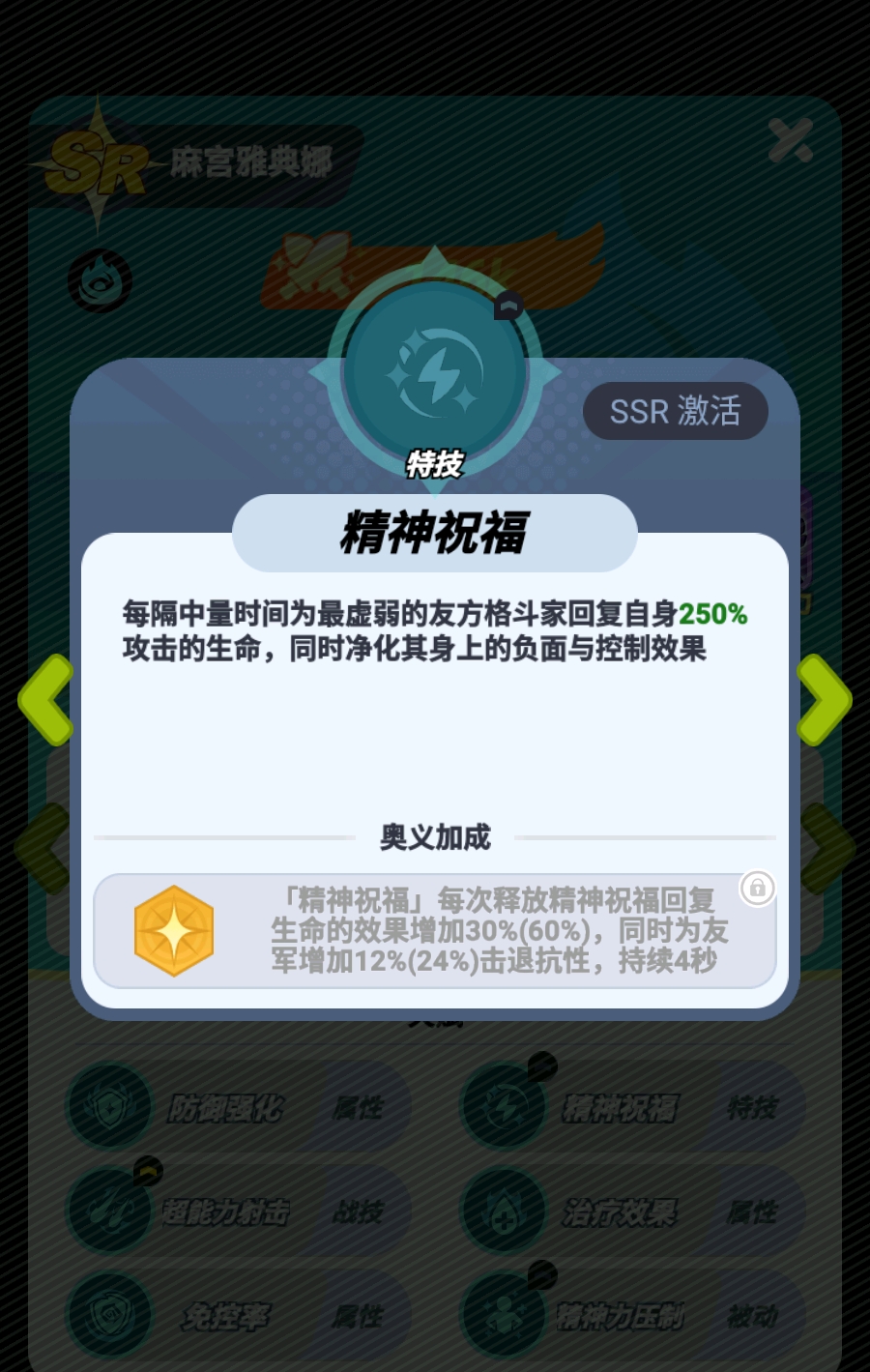 此外,麻宫雅典娜的战技也有着很强势的机制,在释放时不光能对敌人造成高倍率的伤害,还能对敌人造成高倍击退效果,实战中能直接将近身的敌人推远,进一步强化队伍的控场能力。若是麻宫雅典娜激活了奥义,那在释放战技时,麻宫雅典娜还能为自己回血,强化自身在战斗中的生存能力。而且一旦她升到了SSR品质,还能不依赖必杀为血量最低的队友间歇性地施加一次治疗,并清理掉队友身上的负面和控制,这也令麻宫雅典娜对团队的增益会再上升一个档次,所以玩家若是有机会,很建议将麻宫雅典娜突破至SSR品质。
