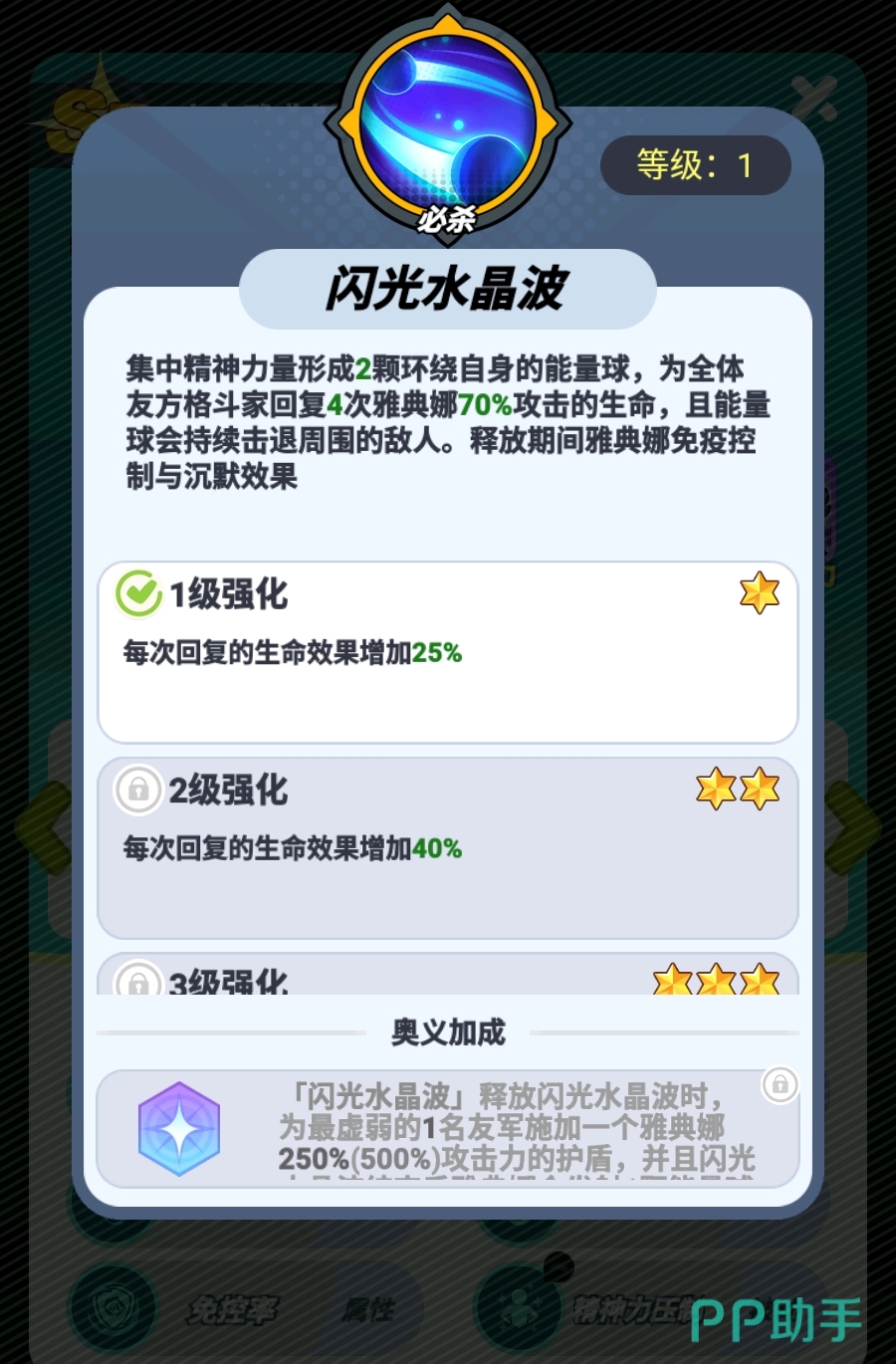 必杀是麻宫雅典娜最为重要的技能,释放时麻宫雅典娜会生成能力球为队友回复生命,且本次回复面对的是全体队友,不管队友与麻宫雅典娜距离多远,都能吃到本次必杀的治疗效果,这也令麻宫雅典娜有着极强的保人能力。若是必杀释放时麻宫雅典娜身边有敌人,那本次必杀还会持续对敌方造成击退效果,而且必杀存续期间,麻宫雅典娜还能免疫任何控制,所以除非敌人能将麻宫雅典娜击杀,否则没办法打断她的必杀。