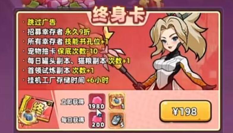 针对战斗力的提升,玩家如果合理地运用终身卡其实也会有效果。玩家如果没有开卡,那么幸存者只有4本技能书,开卡之后还能够解锁一个孔位,直接就变成了5本。如果技能搭配合理的话,他的战斗力通常情况下将会上一个档次。当然,玩家发现如果开卡还能够领取1980钻石,跟传说加技能书玻璃大炮。