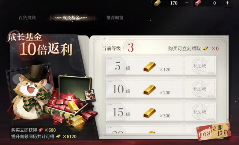 想获得更多资源,玩家可以选择充值68,充值的成长基金可以得到10倍返利,充值之后立即获得680红砖,随着等级提升,角色可以得到6120金砖,红砖可以直接领取,金砖要随着玩家的等级提升,逐渐获取对应数量,是相对比较激励玩家提升自身能力的一种氪金选项,每提升1级都可以领取不同数量的金砖,玩家在1~60级都能稳定获取金砖资源。