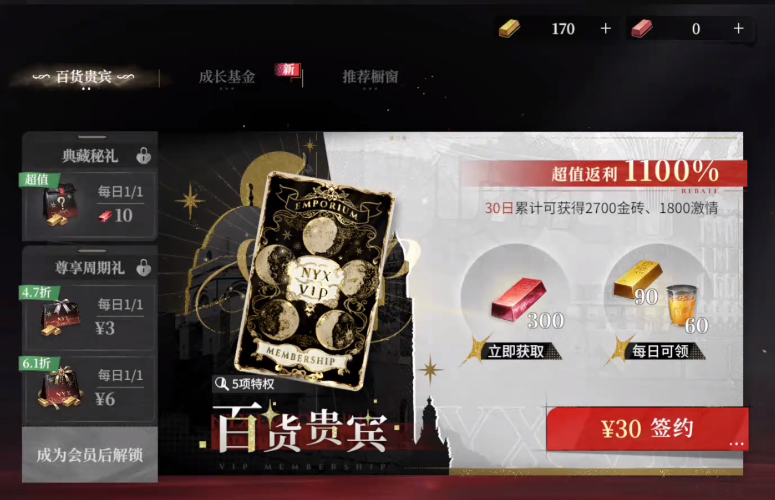 游戏里并不会设定强制氪金,是否要在游戏里充值,要看玩家个人的需求,不想充值的成员要多去参与游戏的各项任务,利用游戏任务获取大量资源,想要氪金的玩家,可以去挑选适合自己的氪金选项,玩家可以选择首充6元领取上任致礼,连续三天时间,每天都可以领取特定奖励,算是游戏里比较基础的充值,游戏里还会设置百货贵宾充值玩法,花费30元可以在30天的时间里每天领取金砖、红砖和激情奖励,连续30天可以累计领取300红砖,2700金砖和1800激情。