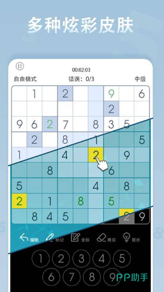经典数独不花哨,填数解谜乐无涯,新手入门无压力,老手挑战也不差。遵循传统九宫格数独规则,玩家在9×9的格子里,按照每行每列每个小九宫格数字1到9不重复的要求,填完空白格子即可。游戏分入门,进阶,高阶三个难度档位,新手能慢慢熟悉规则,老手能挑战高难度关卡,界面干净无多余广告,操作时可以标记候选数字,填错会及时提醒,不用反复核对,随时随地都能打开玩一局。