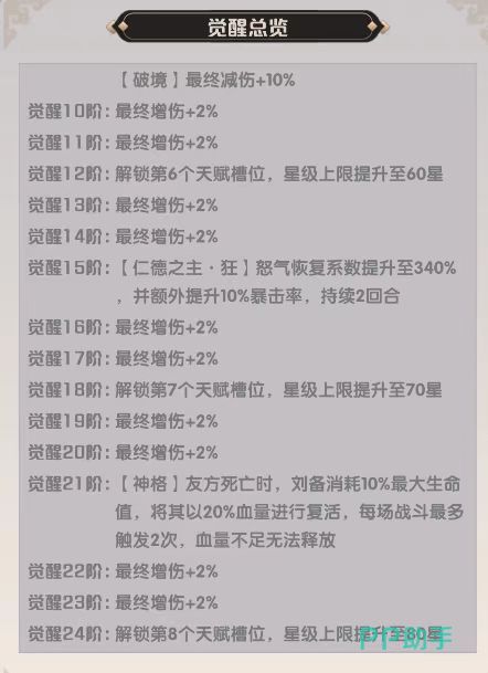 羁绊系统进一步放大刘备的战略价值。“桃园结义”羁绊需同时上阵刘备、关羽、张飞三位蜀国武将,激活后全队攻击提升12%,是构建高爆发蜀系阵容的重要基石。因此,推荐围绕蜀国阵营组建主力队伍,以充分触发多层阵营加成。此外,刘备作为传说品质武将支持深度觉醒,最高可达24阶,每阶觉醒不仅提升最终增伤比例,还逐步解锁第八个天赋槽位,同步将星级上限拓展至80星,实现质变式成长。
