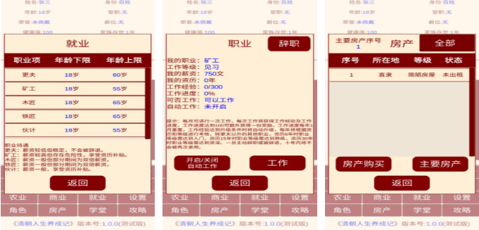 本作是款能让玩家穿越到清朝时代体验人生的模拟器手游,养成人生和角色的游戏玩法自由度更高,文字互动的养成理念也是很多养成游戏粉丝的最爱,轻松好玩的养成节奏无疑有着更高的参与感,加入了形形色色的职业可以自由选择并开发人生,清朝人生的养成互动玩法带来的娱乐性相当不错。