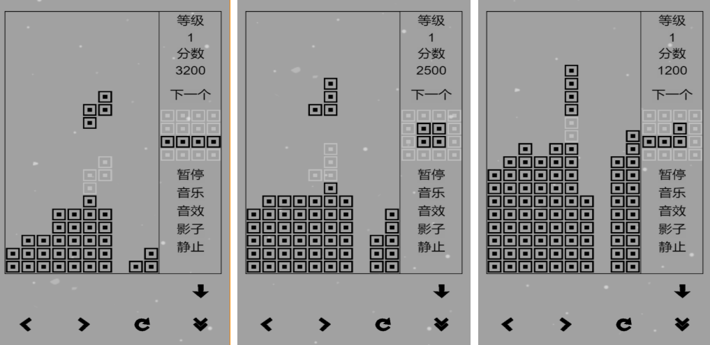 这款黑白版本的俄罗斯方块消除游戏辨识度更高,黑白灰风格的背景让俄罗斯方块高手眼前一亮,可以自由选择下落的速度和方块的方向,很简单的操作机制和快节奏消除快感令人着迷,黑白版本的背景刻画给人带来的观赏性不错,越来越快的下落速度也会让这款消除游戏的可玩性增加。