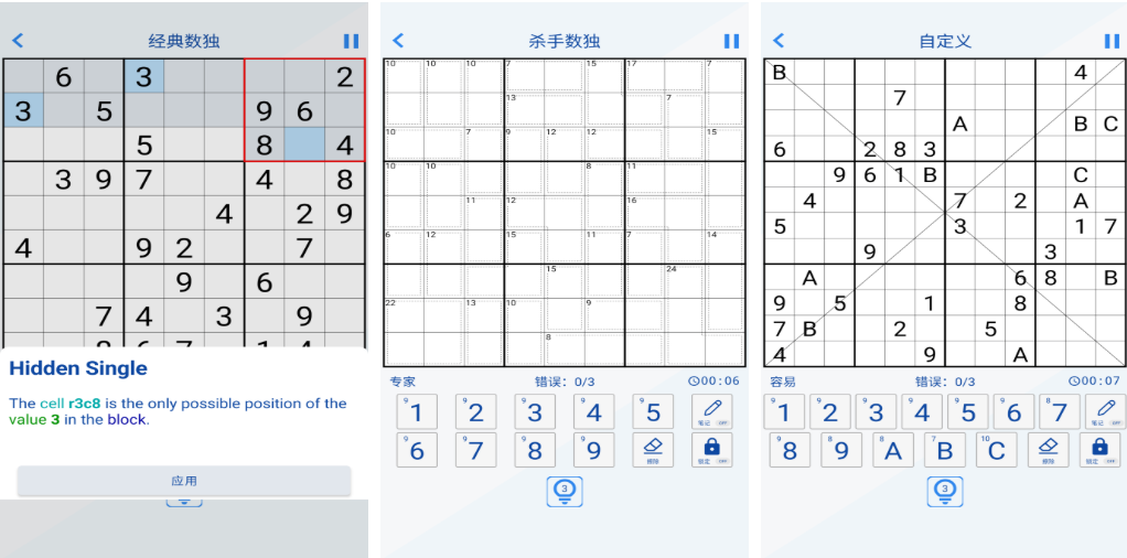 数独高手均可试试这款九宫格简单画面的数独手游,数独主题的解谜玩法带来的互动体验更为特殊,更快的解谜节奏加上丰富的内容吸粉无数,数独高手可以在不同关卡中了解数独手游的魅力,美术表现简约无疑给人一种舒适的视觉效果,也加入了自定义难度的闯关模式玩起来十分过瘾。