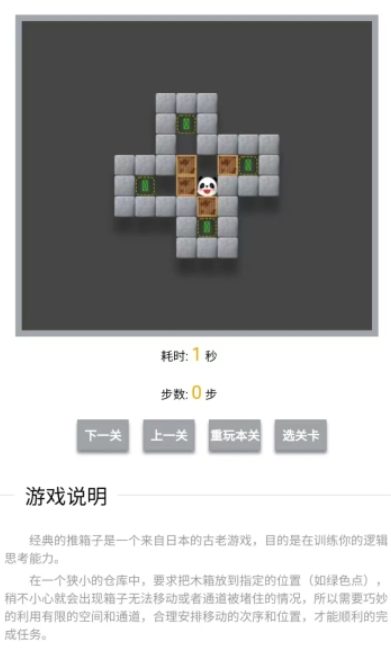 推箱子手游爱好者都可进入本作尝试将箱子推回原地,游戏画面明亮也有着简单的美术表现,熊猫主题的角色看上去呆萌可爱,众多有趣的推箱子关卡让玩家脑洞大开,如果觉得关卡太难还可以随时重启,更多标新立异的玩法塑造让推箱子爱好者流连忘返,你也试着进入这些推箱子手游中挑战下吧。