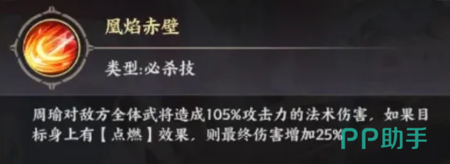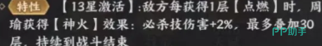 该阵容兼具输出与生存韧性。周瑜作为核心输出位,星级达标后战力跃升明显:16星时必杀技基础伤害达200%,且附带全体105%攻击加成;当目标处于点燃状态时,最终伤害额外提升25%。装备策略上,优先配置法锥与法功类僵硬,大幅提升暴击伤害转化效率。更关键的是其被动成长性——13星起,敌方每存在1层点燃,周瑜即获得1层“神火”,每层提升必杀技2%伤害,最高可叠加30层,使终期爆发数值实现质变式增长。