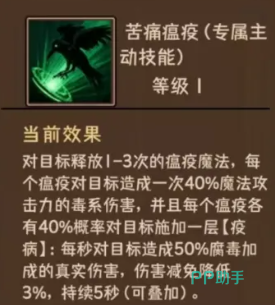 毒系主打持续压血与真实伤害转化。“苦痛瘟疫”支持1至3次连续施放,具体次数取决于当前能量储备及回合行动点。每次释放造成40%魔法攻击,并有40%概率附加“疫病”状态:该状态每秒造成50%腐毒伤害,且全部为真实伤害类型;同时使目标攻击降低3%。此机制使其在持久战、高难度副本及BOSS战中具备独特战略价值。