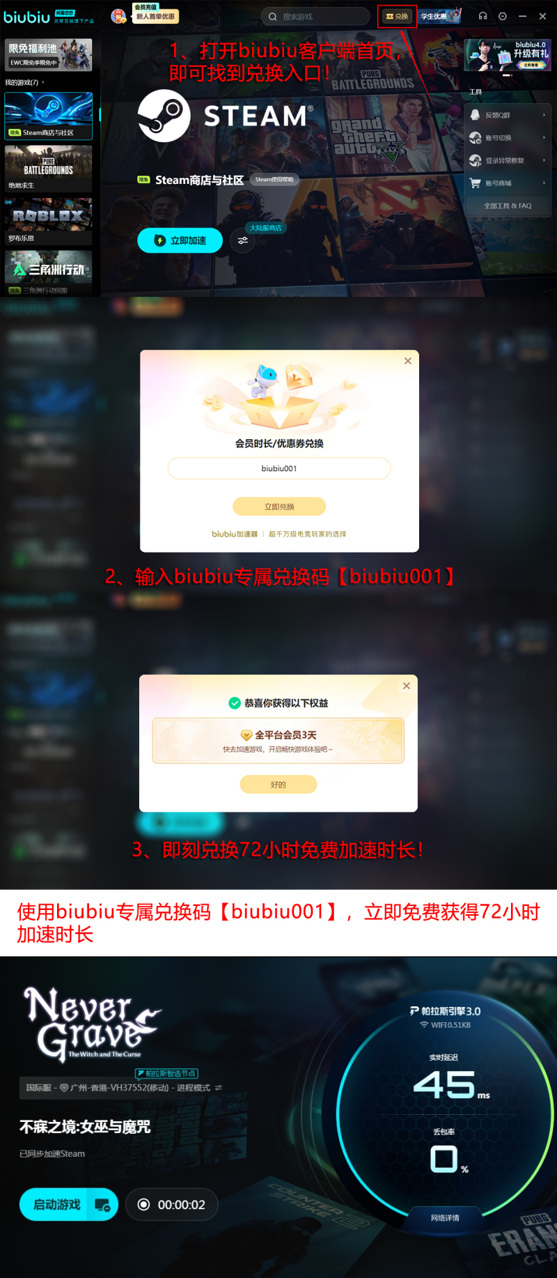biubiu加速器专为高同步性联机场景深度优化,在降低丢包率、压缩端到端延迟方面表现突出。其技术底座整合帕拉斯3.0引擎架构,并获得职业电竞选手小叮当(PUBG项目冠军)实测背书;同时,该产品与九游、交易猫同属阿里巴巴灵犀互娱旗下生态应用。依托成熟的技术协同体系,已成为大量联机玩家的稳定首选方案。当前新用户注册即可领取24小时免费加速时长,叠加专属兑换码【biubiu001】所赠的3天权益,总计可享96小时无限制加速服务,全面覆盖多周目联机需求。